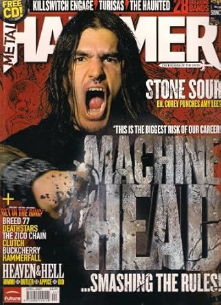 There is an image of a man, screaming, I am taking it he is not letting out a yelp of joy, or saying cheese, as he seems very angry.This mans fist has been Photoshopped to punch the stone letters MACHINE HEAD. I can tell that MACHINE HEAD is Photoshopped in at there is no way such a small man could smash stone with his fist, he's not even looking at where he's punching. Down the left hand side there are other bands that are featuring in the magazine, as well as the bar code. The title is layered behind the mans head, covering up one of the letter M. We know the word behind his head says hammer, because no other word could reasonably fit in there, although for a small while i did indeed think it said METAL HATMER, I have however discovered Hatmer, is not a word. Along the very top of the magazine there is a small banner, advertising important things the has, such as a free CD, and 28 breaking bands.What does it tell us about this publication?